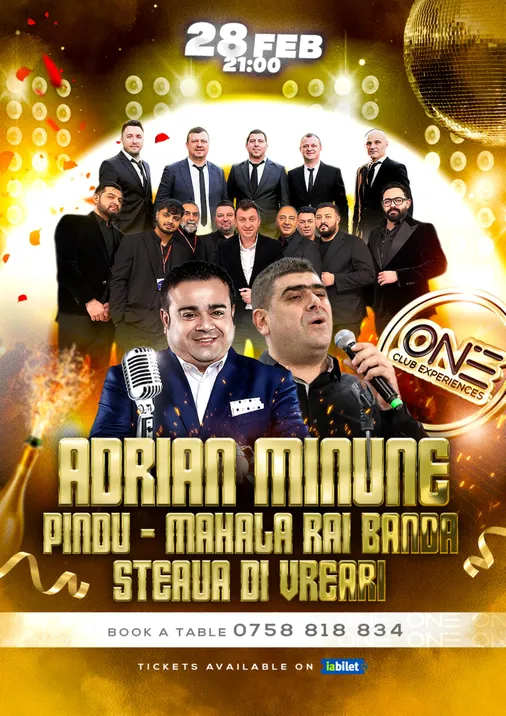 Evenimentul va fi o seară specială cu Adrian Minune, Pindu, Mahala Rai Banda & Steaua di Vreari la ONE Club, pe 28 Februarie, începând de la ora 21:00. Te vei bucura de muzică live și de o experiență de neuitat. Biletele sunt disponibile pe iaBilet, iar pentru rezervări de mese, poți suna la 0758 818 834.
