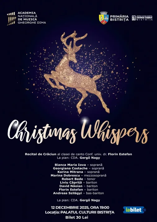 Christmas Whispers este mai mult decât un simplu concert de colinde – este o întâlnire autentică între tradiție și rafinament, între bucuria tinereții și emoția sinceră a sărbătorilor. Protagoniștii acestui recital sunt tineri interpreți studenți ai clasei de canto coordonate de conf. univ. dr. Florin Estefan și CDA Gergő Nagy: Bianca Iova – Sopran, Karina Mitrană – Sopran, Georgiana Costache – Sopran, Marina Dobrescu – Mezzosopran, Robert Bede – Tenor, Liviu Căpriță – Bariton, David Năoian – Bariton, Andreas Szilágyi – Bas