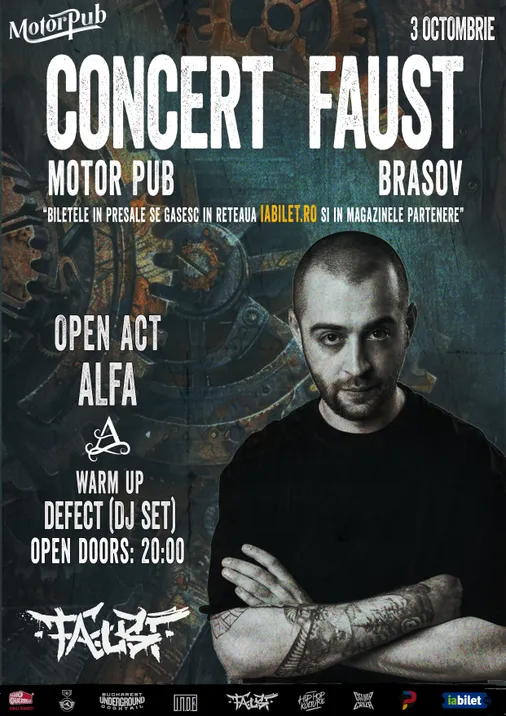 Salutari! Incepem sezonul de toamna si urmeaza sa ne vedem si in orasul tau. Astfel, pe 3 Octombrie, va invitam la concert Faust, in Brasov. Evenimentul se va desfasura in Motor Pub. Pe parcursul serii veti putea asculta piese din intregul repertoriu al artistului, precum si piese din playlistul noului album. Warm-up-ul va fi asigurat de catre Defect (DJ) si open act-ul de catre ALFA. Va asteptam cu drag la show, incepand cu orele 20:00!