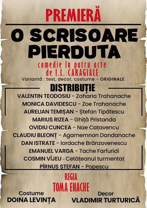 „O scrisoare pierdută” de I.L. Caragiale, piatra de temelie a comediei românești, renaște pe scenă într-o montare care păstrează cu sfințenie spiritul original al capodoperei. Această premieră nu aduce modernizări, reinterpretări sau artificii contemporane: decorurile, costumele și atmosfera sunt redate cu aceeași noblețe și autenticitate care au fascinat generații întregi. Show more details