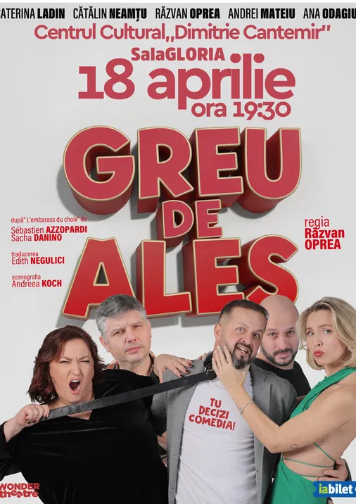 Fiecare spectacol „Greu de ales” e o premieră! De ce? Pentru că povestea se schimbă de fiecare dată după cum vrea publicul. L-ai văzut o dată? Poți reveni a doua, a treia sau chiar a patra oară– niciodată nu va fi la fel. Așa cum se întâmplă și în viață.