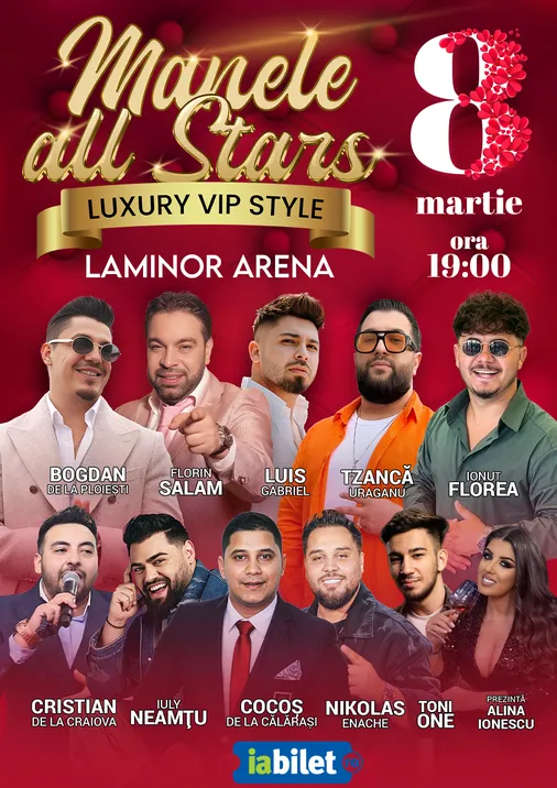 O nouă ediție Manele All Stars te așteaptă la Laminor Arena, pe 8 martie cu Bogdan de la Ploiești, Florin Salam, Luis Gabriel, Tzancă Uraganu, Ionut Florea, Cristian de la Craiova, Iuly Neamțu, Cocos de la Călărași, Nikolas Enache, Toni One
