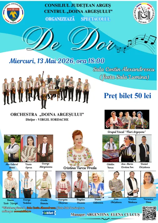 Vino să trăiești o seară de neuitat alături de Orchestra „Doina Argeșului” și invitați îndrăgiți ai folclorului românesc, pe 13 mai 2026, de la ora 18:00, la Sala „Costin Alexandrescu” din Pitești.