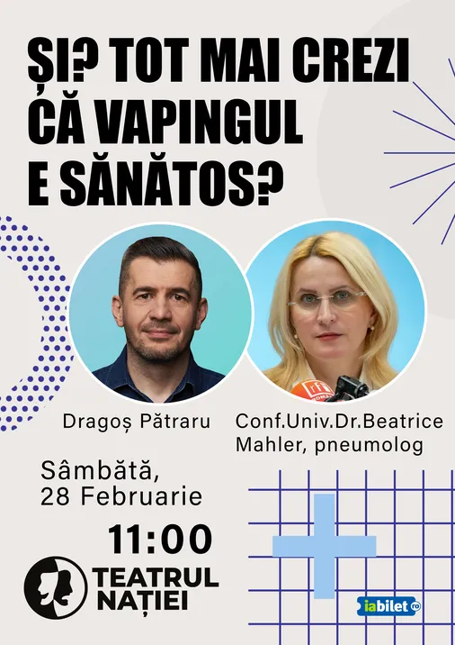 Te așteptăm sâmbătă, 28 februarie, de la ora 11:00, la Teatrul Nației, pentru o discuție între Conf.Univ.Dr. Beatrice Mahler, pneumolog, și Dragoș Pătraru!