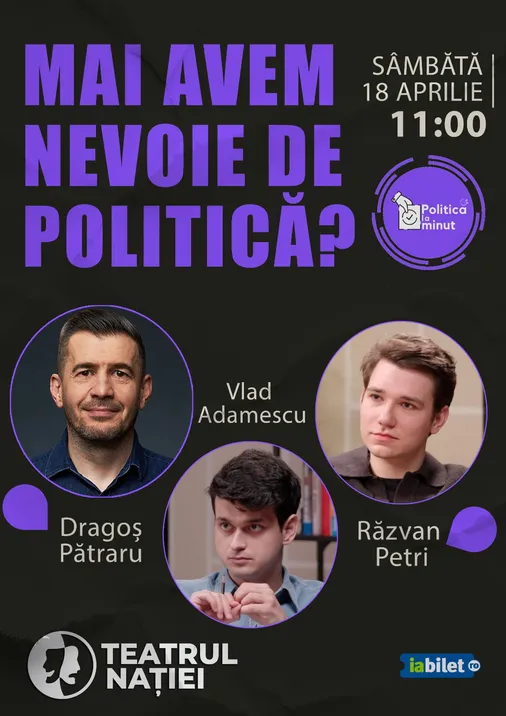 Te așteptăm sâmbătă, 18 aprilie, de la ora 11:00, la Teatrul Nației, pentru o discuție cu Vlad Adamescu, Răzvan Petri (Politică la minut) și Dragoș Pătraru! Show more details