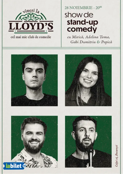 Vineri, 28 noiembrie, ora 20:00, te așteptăm la Lloyd's Comedy Club să te distrezi alături de noi la un Show de Stand-up Comedy oferit de 5 comedianți talentați, pregătiți să te facă să râzi cu momentele lor pline de umor.