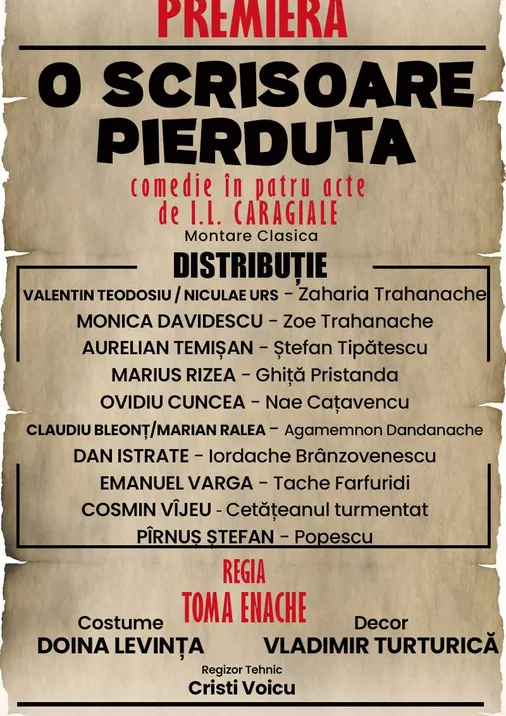 „O scrisoare pierdută” de I.L. Caragiale, piatra de temelie a comediei românești, renaște pe scenă într-o montare care păstrează cu sfințenie spiritul original al capodoperei. Această premieră nu aduce modernizări, reinterpretări sau artificii contemporane: decorurile, costumele și atmosfera sunt redate cu aceeași noblețe și autenticitate care au fascinat generații întregi.