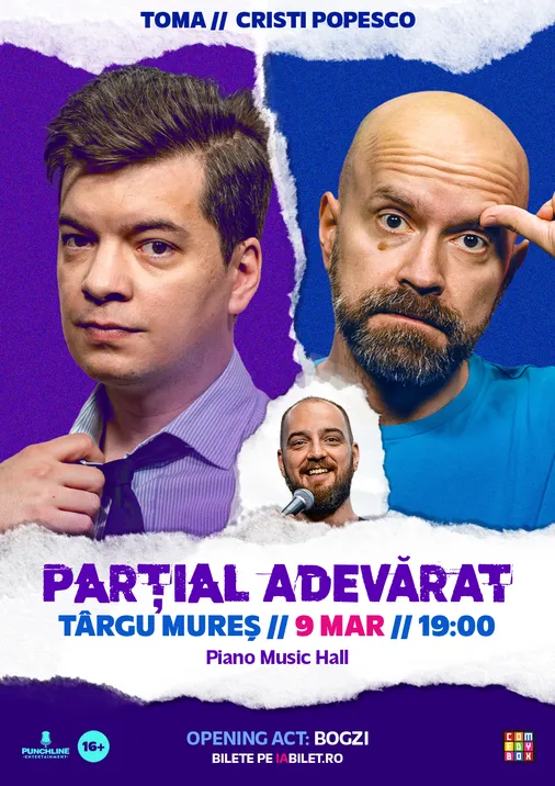 Îi știi de la televizor, de pe YouTube sau de la ComedyBox. I-ai văzut în Una Scurtă, Râzi că Prostu’ sau te-ai uitat la podcastul Ceva Mărunt, iar acum poți să-i vezi LIVE! Cristi Popesco și Toma pleacă primăvara asta în turneu cu material nou, glume noi și povești care te vor face să râzi în hohote! Hai să-i vezi și tu în cel mai nou show al lor: Parțial Adevărat! Locurile sunt limitate, așa că ia-ți biletele din timp și asigură-ți locul la cel mai așteptat show de Stand-up Comedy al primăverii!