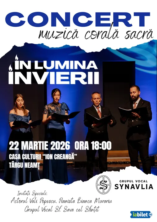Pe 22 martie, de la ora 18:00, publicul din Târgu Neamț este invitat la concertul „În Lumina Învierii”, un eveniment de muzică corală sacră, cu caracter artistic și religios, dedicat perioadei premergătoare Sărbătorii Paștelui.